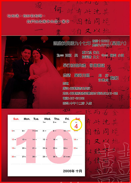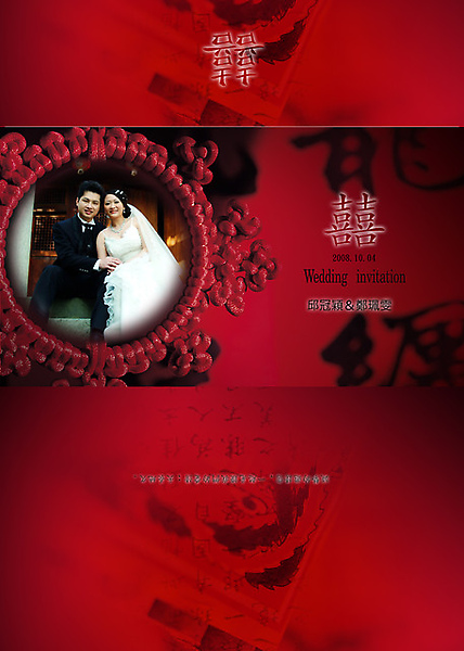 <!-- Origin Article URL: http://www.wretch.cc/blog/flylovewind/10353567 --> 喜帖的封面↓<br> <br> <a target="_blank" href="http://www.wretch.cc/album/show.php?i=flylovewind&b=32764&f=1564965175.jpg"><img border="0" src="http://pic.pimg.tw/flylovewind/4b9ad06f1e94d.jpg?v=1268437103"/></a><br /> <br> <br> 喜帖的內文↓<br> <br> <a target="_blank" href="http://www.wretch.cc/album/show.php?i=flylovewind&b=32764&f=1564965176.jpg"><img border="0" src="http://pic.pimg.tw/flylovewind/4b9ad06f8e666.jpg?v=1268437103"/></a><br />